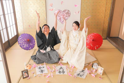 お二人の思い出のものであったり、習字やお面などを使用していただくことによって より可愛いお写真になります!
