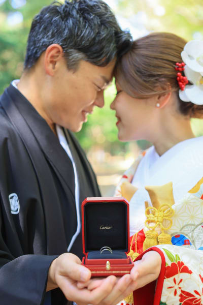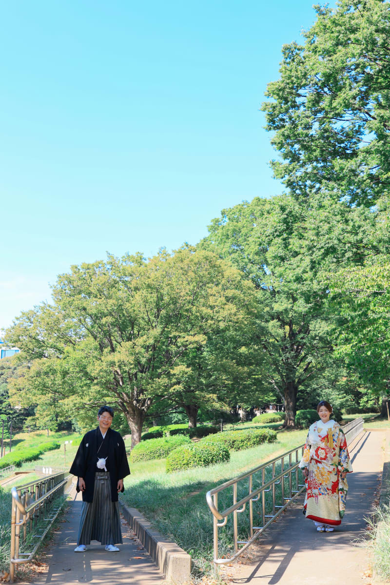 笑顔がとっってもお似合いのお二人^^本日は代々木公園で和装のロケーション撮影です! 自然×和装は相性バッチリ! 雲ひとつない青空のもと緑に包まれたお二人は、暑さすら吹き飛ばす満面の笑みがとっても素敵です☺︎
