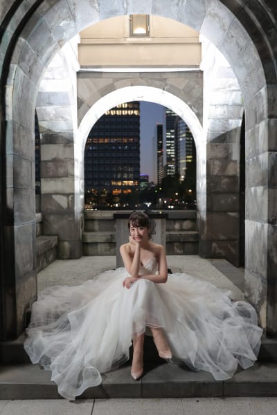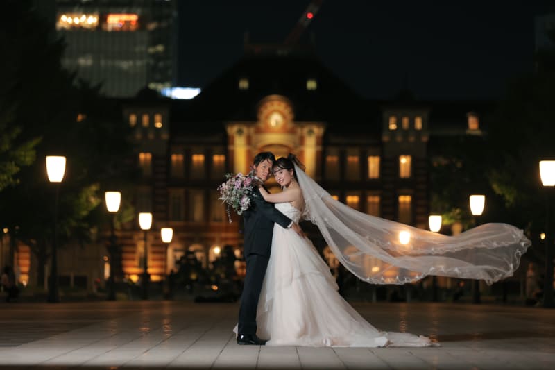 そしてお待ちかねの東京駅前へ移動しました!! ロングベールを靡かせて、幻想的な1枚を。