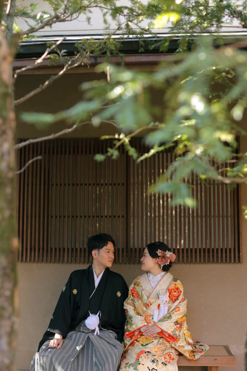 お庭での撮影はまったりお散歩したり、ベンチでおしゃべりしたりなどよりいつものおふたりらしい