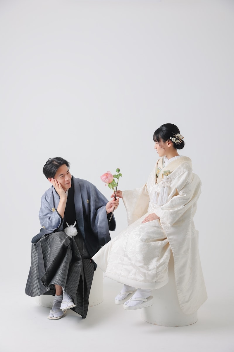 白い空間ならではのお二人が引き立つクリーンさに、一輪のお花が効いていてとっても可愛いです!