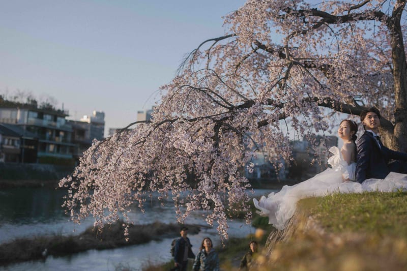 洋装の鴨川では五条大橋の桜が満開でした。背景に鴨川と桜が入るのがかわいいですね。