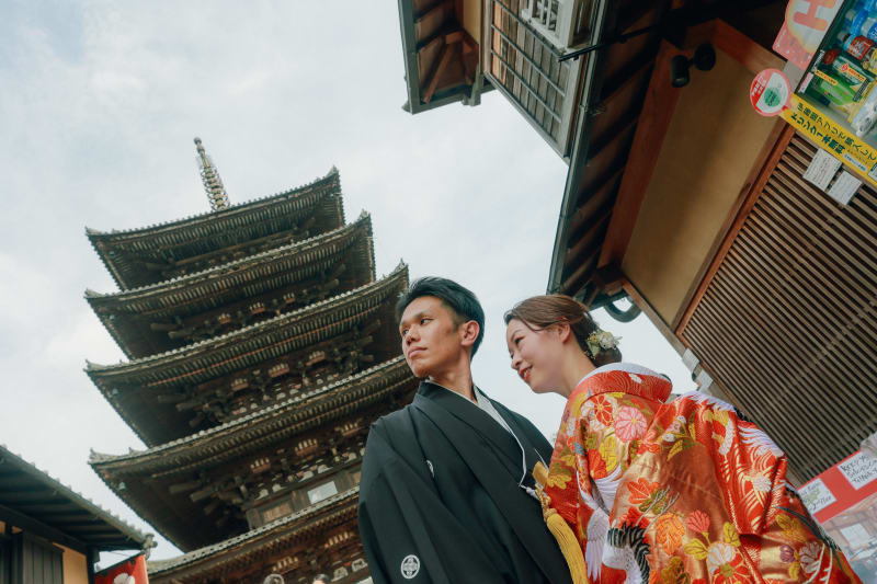 京都らしい八坂の街並みに仲睦まじいいつも通りのお二人の笑顔が溶け込みます♡