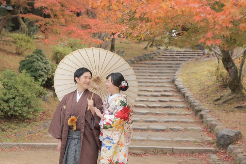 色づく紅葉の下でお二人だけの特別な空間が広がります。