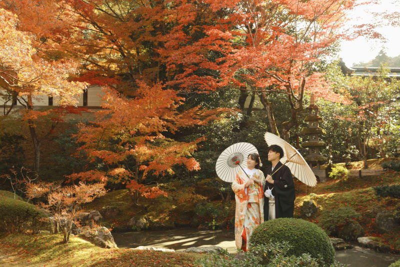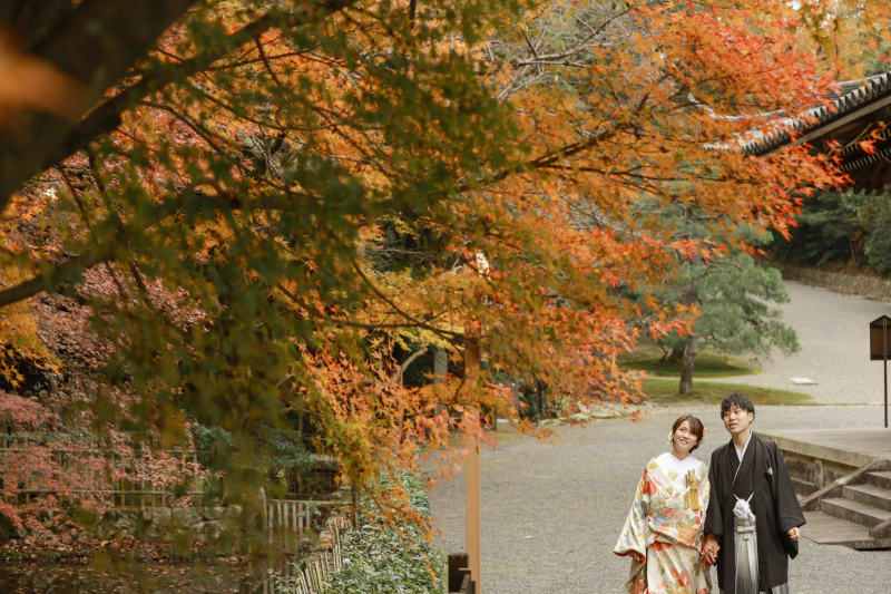 お庭を散歩しながら。お庭にも降りて撮影ができるので、より紅葉に近いところで撮影していただけます。お庭の雰囲気もとても素敵です。