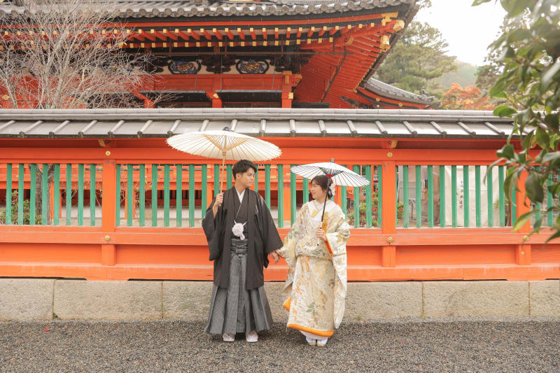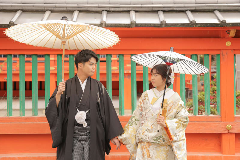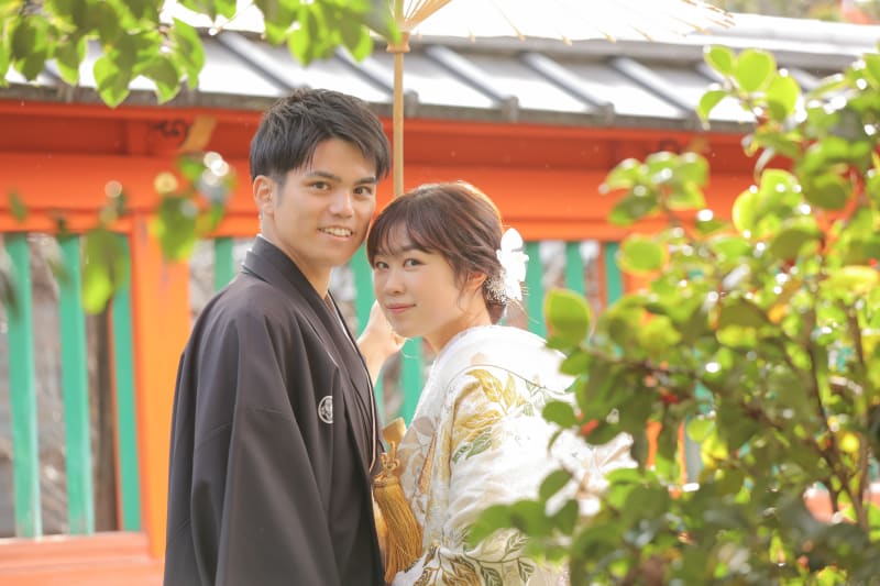 和装に馴染む神社仏閣らしい背景が落ち着いた印象を感じられますね。