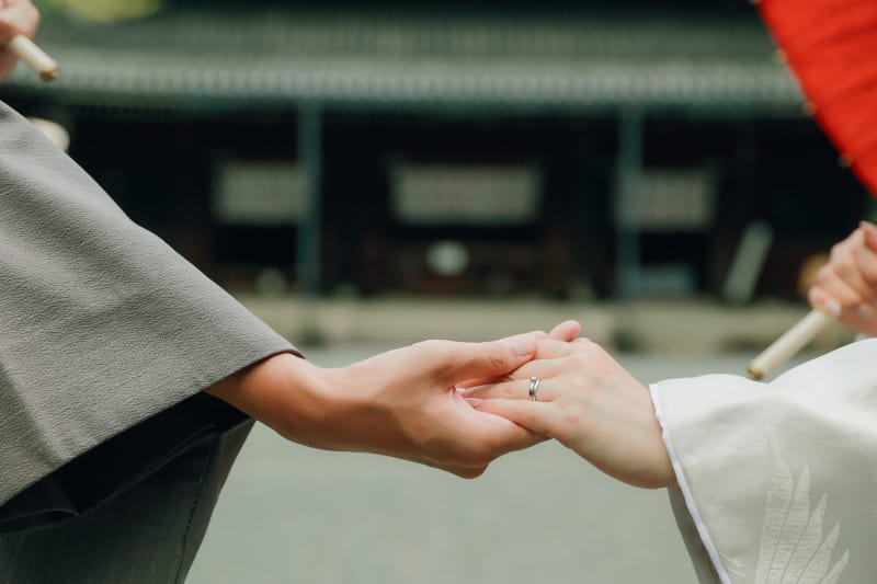 手を取り合いながら和傘を持つお二人