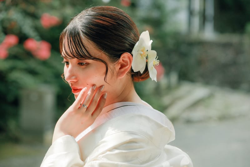 この日の撮影では、新婦様の白無垢がその純白の美しさを際立たせ、まるで緑の中に咲く一輪の花のようでした。