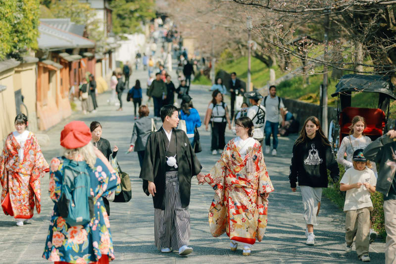 お二人は色打掛と紋付という伝統的な衣装で、八坂の街中をぶらりとお散歩。