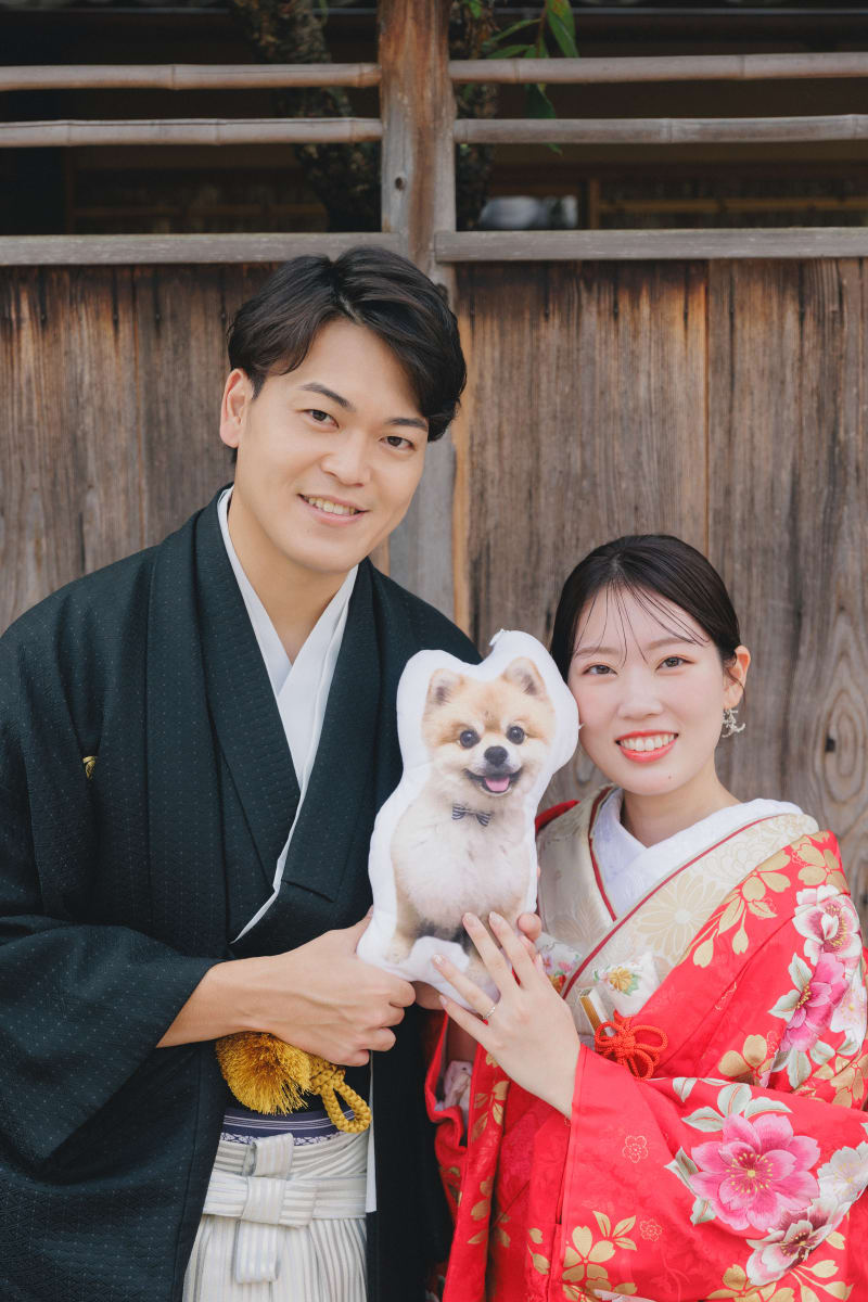 撮影中、新婦様がご実家で大切にしているわんちゃんのクッションが登場