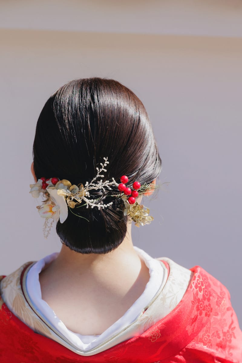 きっちりとまとめられた髪型が和装らしさを引き立て新婦様の凛とした美しさが一層際立ちました。
