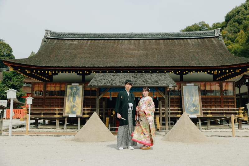 世界文化遺産の1つ『上賀茂神社』。春の桜もきれいな自然あふれる境内は婚礼写真をより美しく残してくれます。