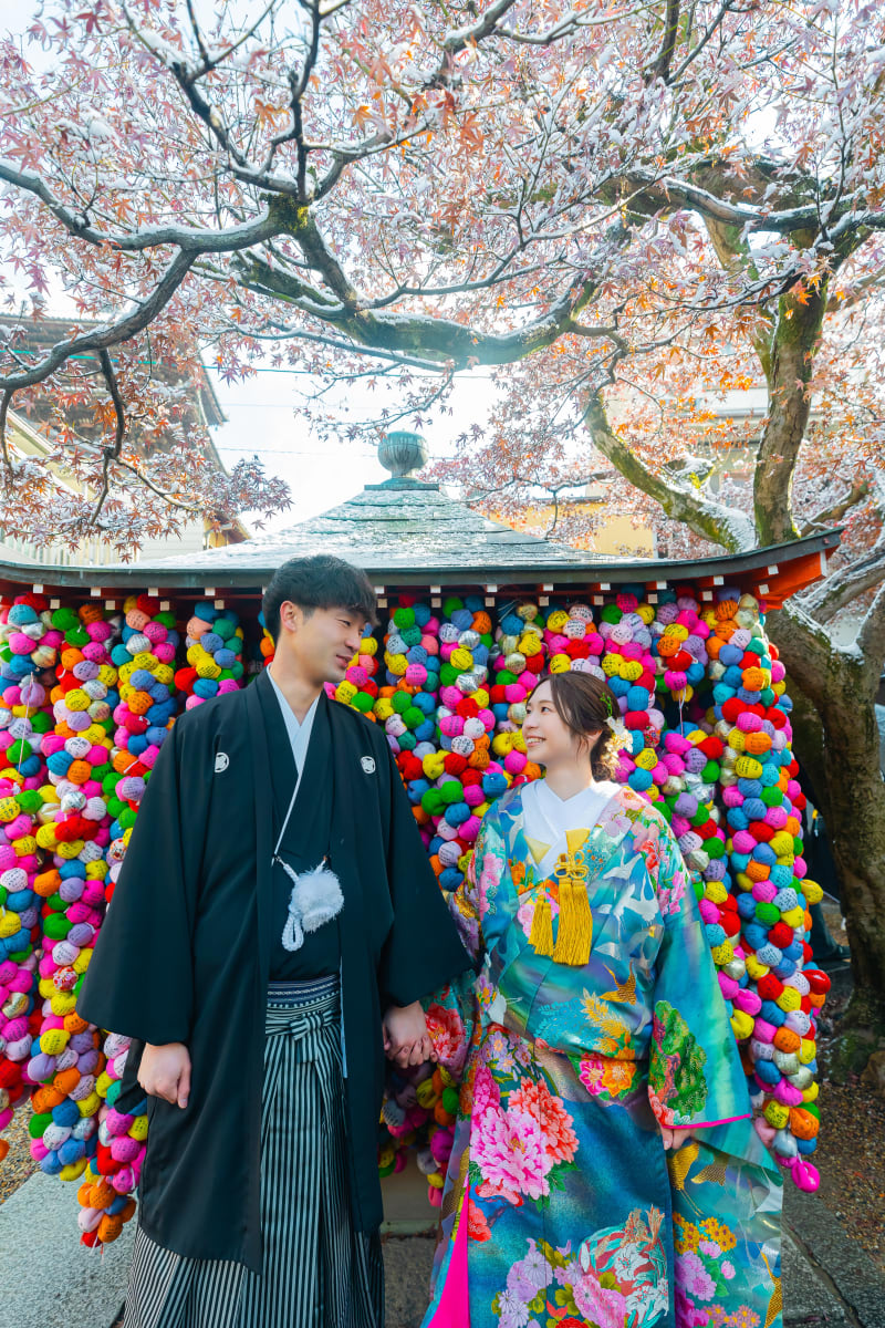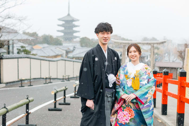 五重塔が背景で和装のお二人が綺麗に映えます。