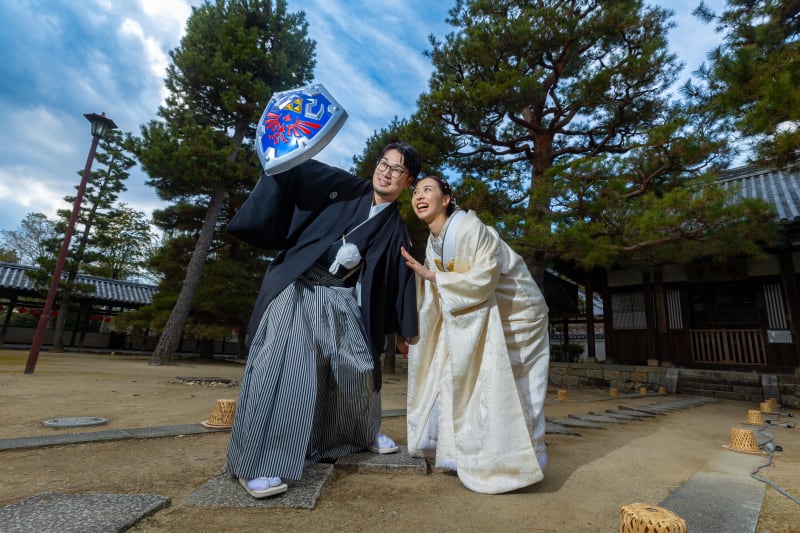青空の下、新郎様は伝説の盾で新婦様と守ります...!