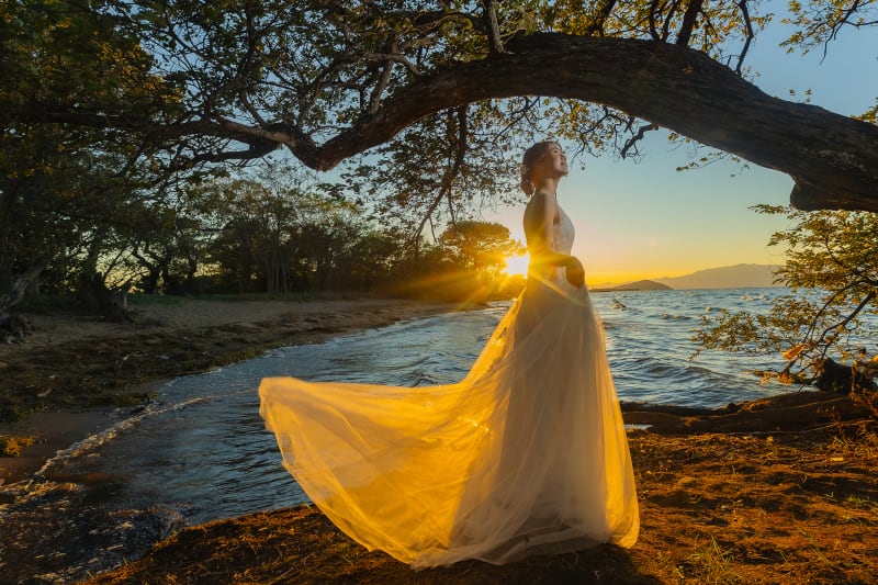 ウェディングドレスに透ける茜色がまるで映画のワンシーンのように幻想的です。