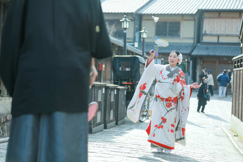なんと、お二人のリクエストで祇園の街中でバトミントンがスタート!