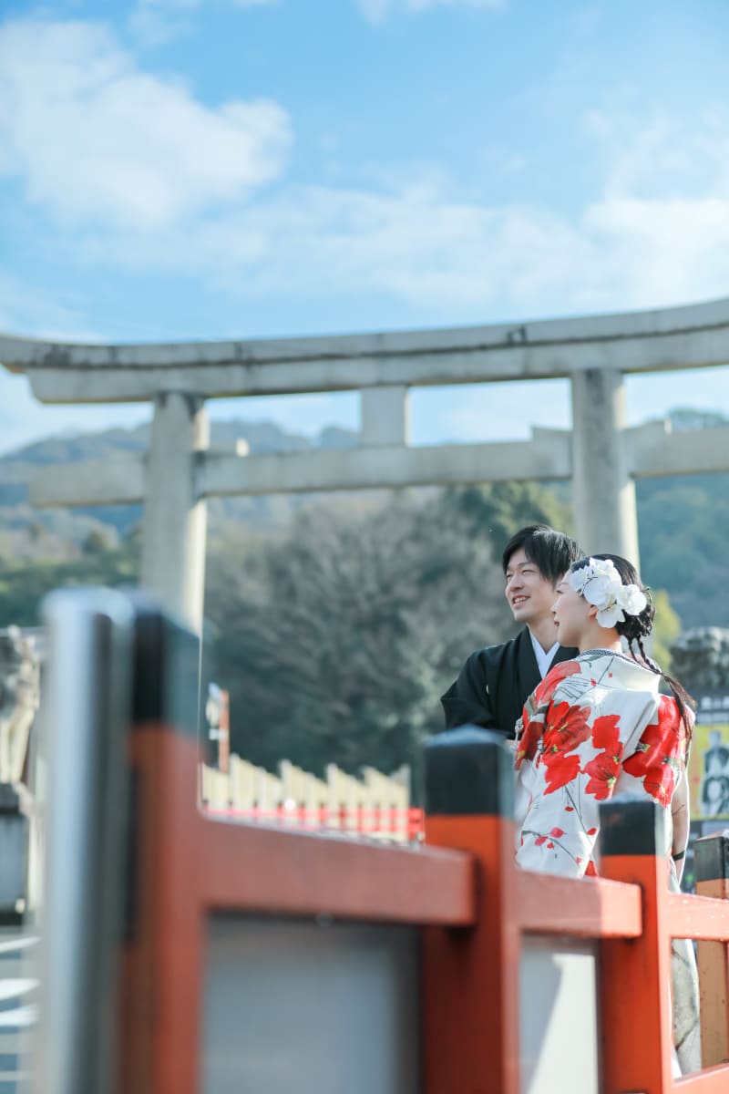 新婦様の赤い花が目を引く色打掛と新郎様の凛々しい紋付が、古都の風情にぴったりと調和し、写真をより一層引き立たせてくれました。