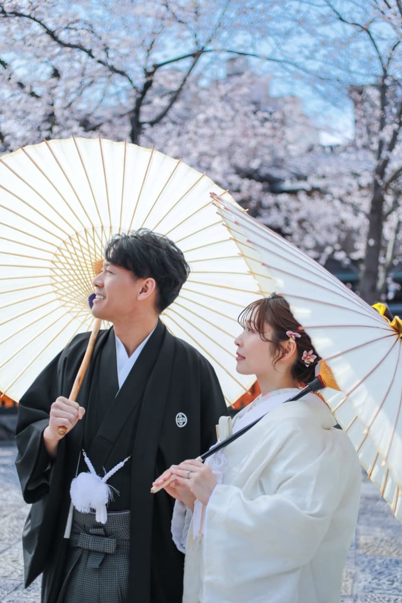 桜をバックに、白無垢姿の新婦様が映え、桜色が白をより美しく引き立てていました。