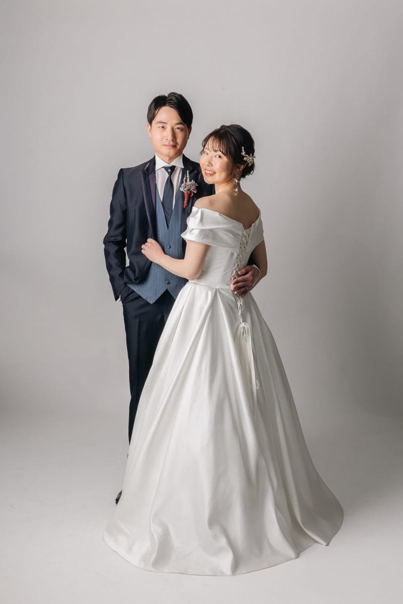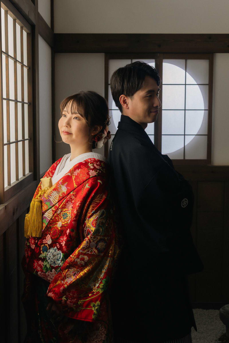 新郎様がシャドウ側に立つことで紋付姿がさらに際立ち、新婦様は優しい光に包まれた雰囲気が印象的でした。