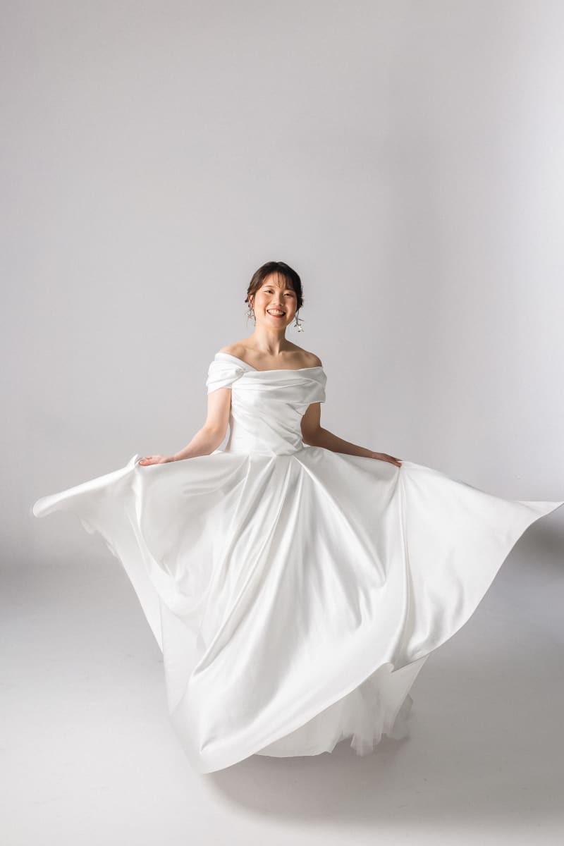 新婦様のトレーンがふんわり広がるシーンは、スタジオだからこそ叶う素敵な一瞬です。