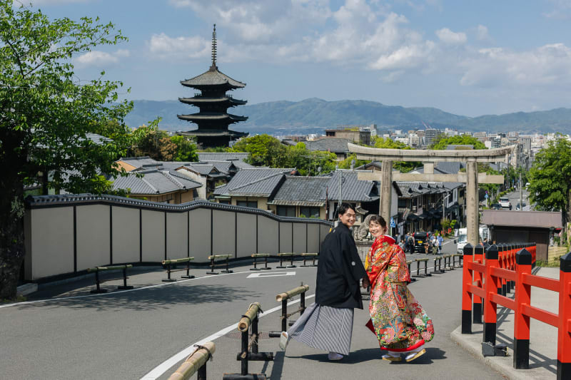 そして、店舗を出て八坂へ向かい、和傘を差した京都の町屋と五重塔を背景に撮影。