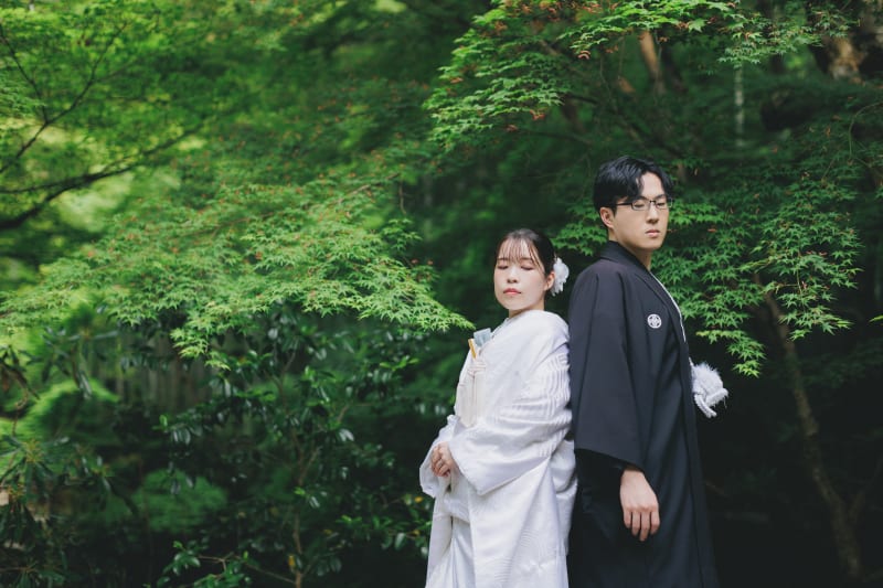 新緑に囲まれて静かで落ち着いた空間での一枚。おふたりの表情がとても素敵です☺︎