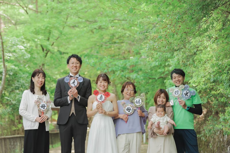 みんなでお二人が作成したアイテムでご家族撮影。みんなが素敵な表情で、幸せな時間が流れていました。