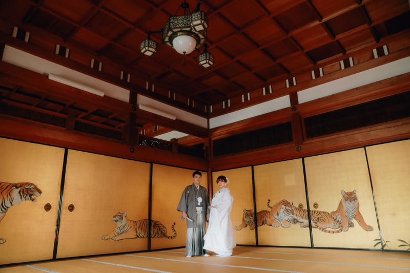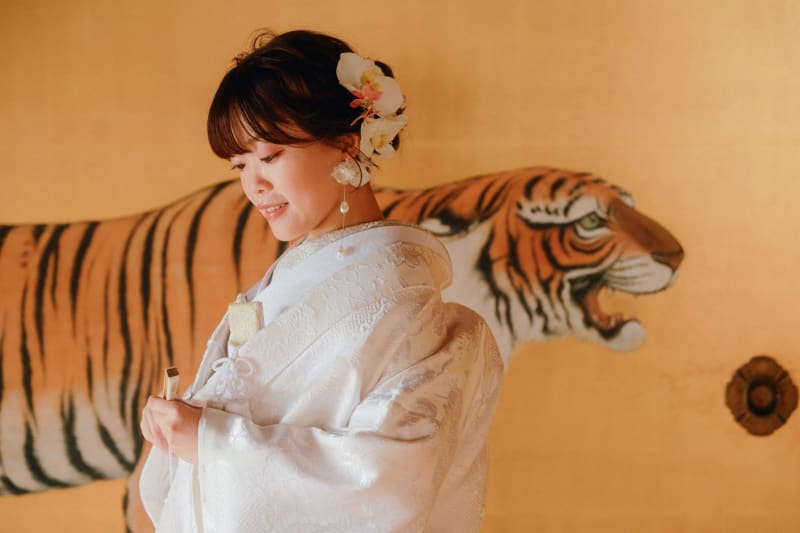 新婦様の白無垢と金屏風、虎の絵がマッチしていて