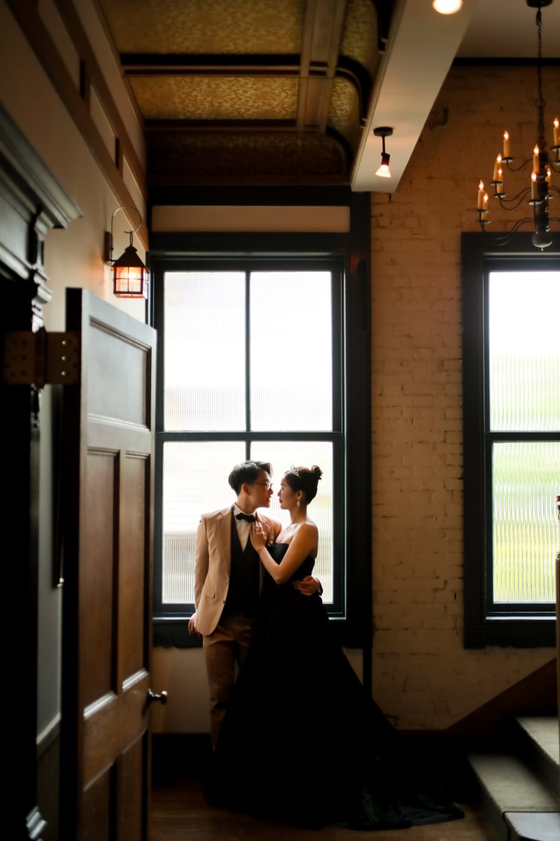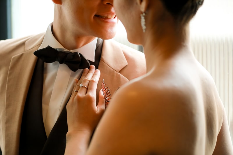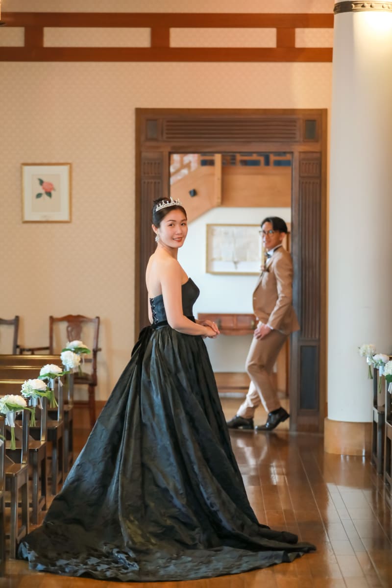 新婦様はブラックドレスを美しく着こなし、新郎様は優しいカラーのタキシードを纏っておりました。