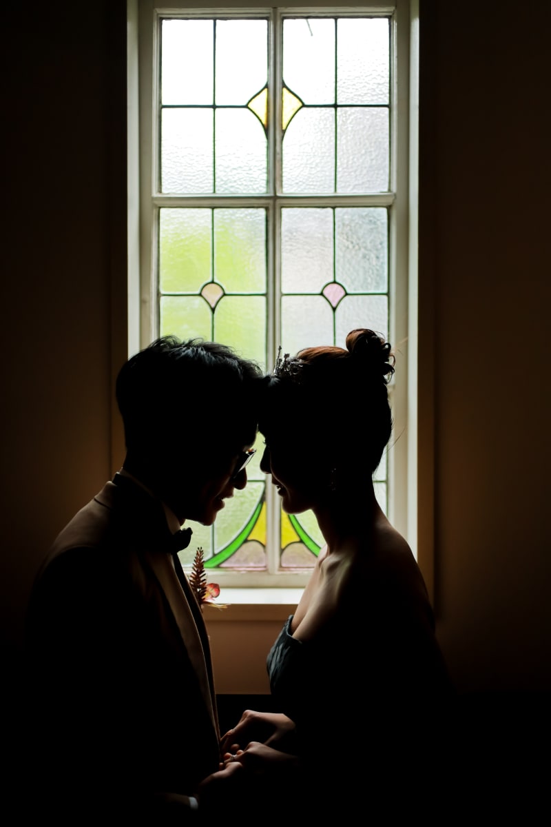 ステンドグラスのクラシカルな雰囲気を背景にした一枚