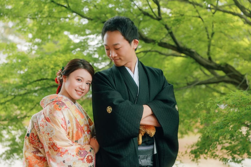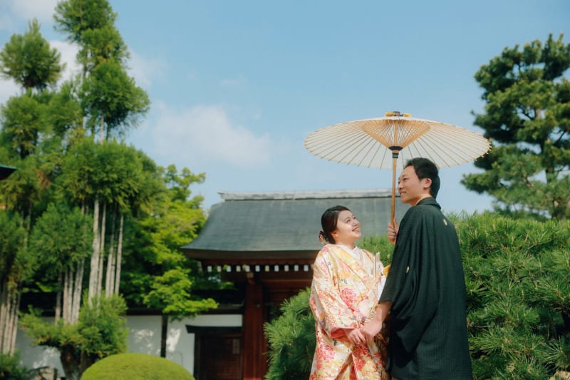 和傘を持ったお二人の後ろ姿と緑溢れる背景が素敵な一枚になりました!