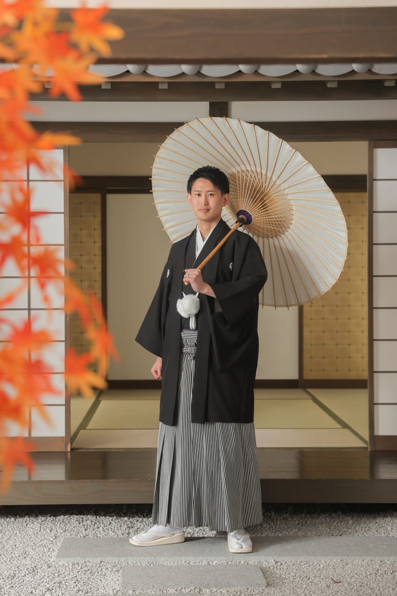 正式な黒紋付に身を包む新郎様の表情が凛々しいです。