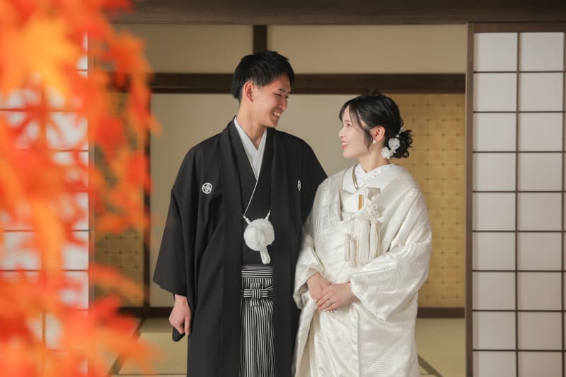 生成りの白無垢と赤の紅葉のコントラストが映えますね。
