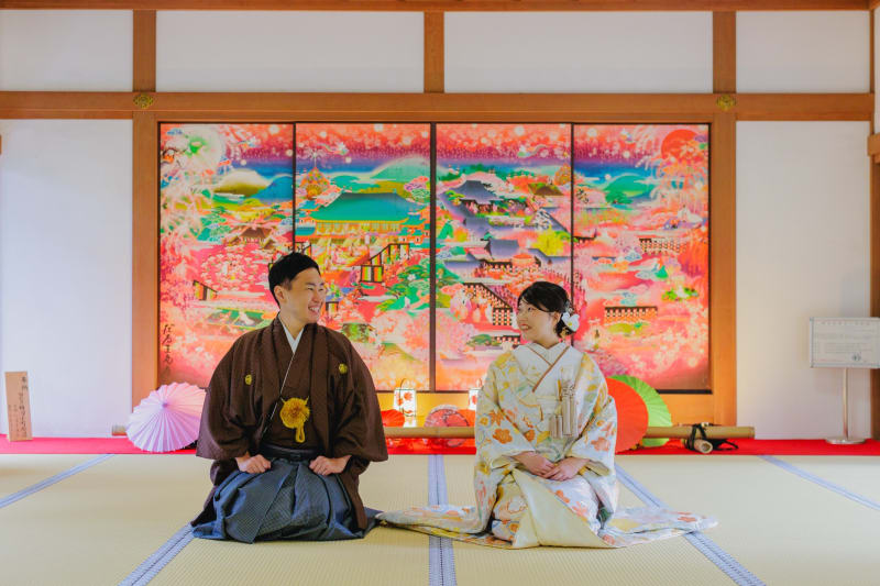 極彩色の豪華な襖絵の前で正座のショットを撮影しました。
