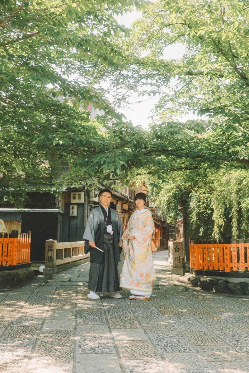 新郎様の紋付と新婦様の色打掛が、歴史ある祇園の風情に溶け込みます