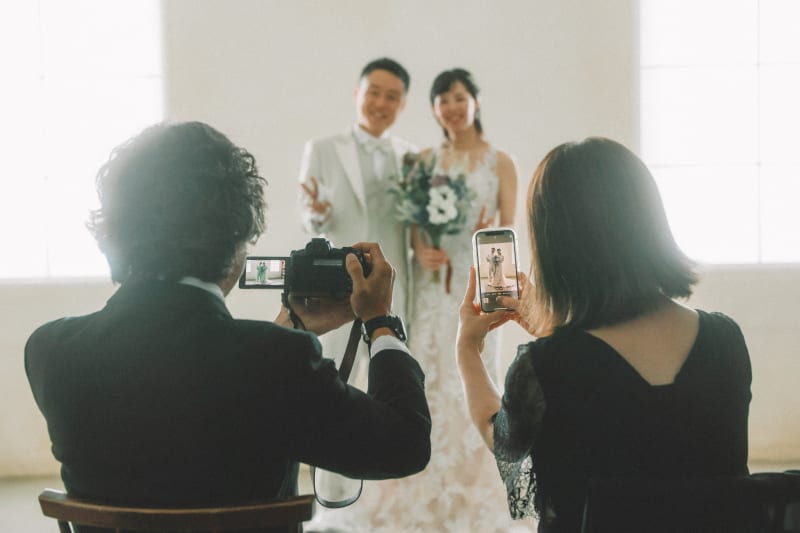 新郎様のタキシードと新婦様のウェディングドレスが、優雅な瞬間を引き立てます。