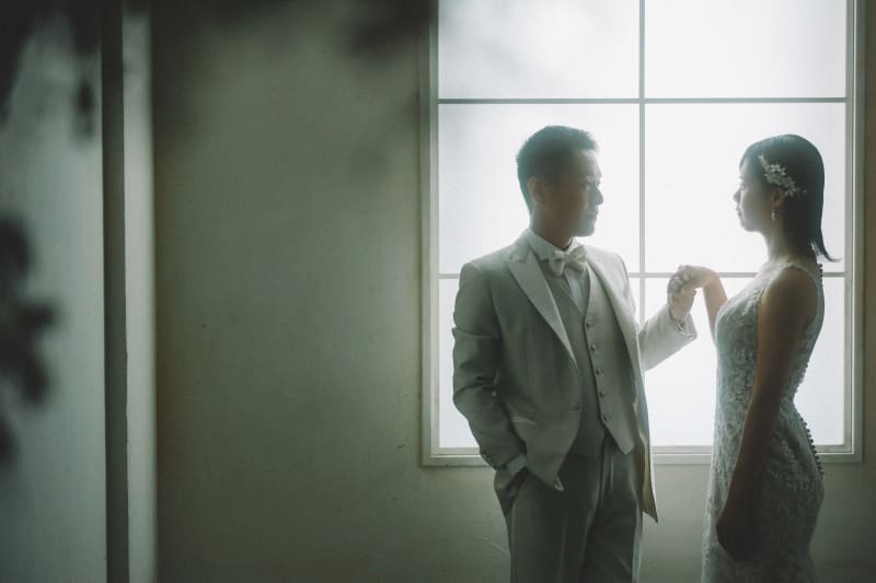 窓際に立ち、お互いを見つめ合うロマンチックなカット