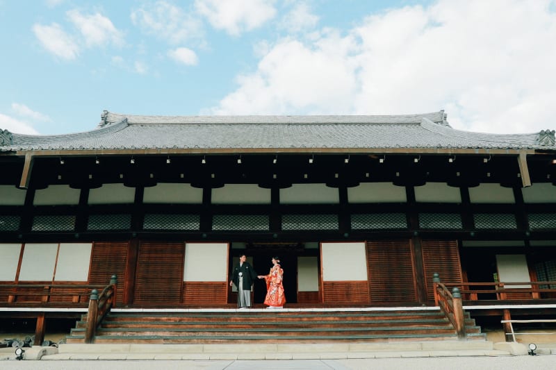 周りに高い建物が少ないので、山門とおふたり、ダイナミックな写真をお撮りいただけます。