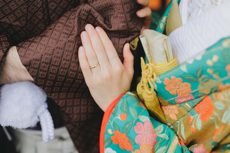 優しい色合いの紋付と鮮やかな色打掛の真ん中には、愛の証であるリングが輝いていました。