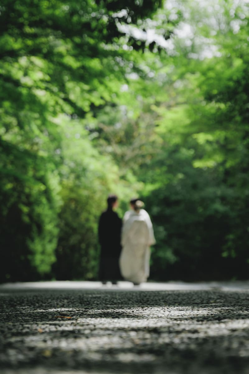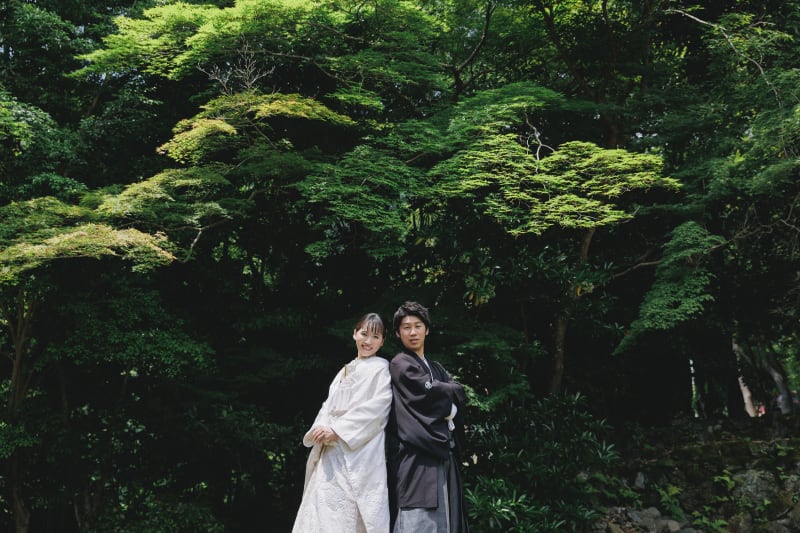 深い緑の中で、新婦様の白無垢が一層輝きを放ち、強い印象を与えています。