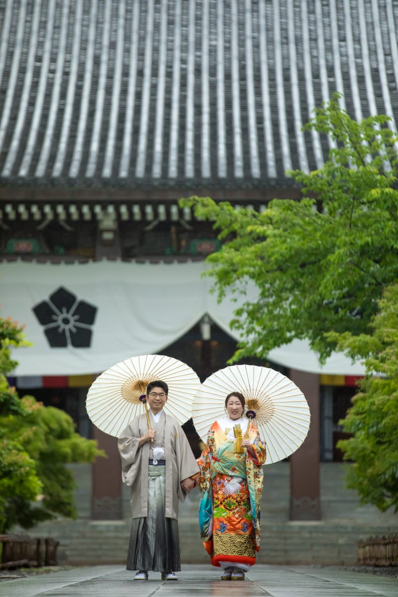 白い和傘が新郎新婦を優しく照らし、自然に視線が集まる一枚となりました。