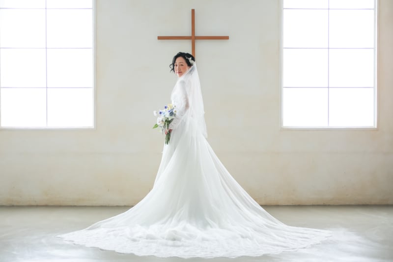 新婦様がお選びいただいたハイネックのドレスがチャペルに美しく映えていました。
