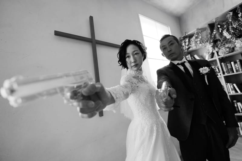 ドレス&タキシードに銃を持つという、まるでオシャレな映画のワンシーンのような写真が撮れました♡