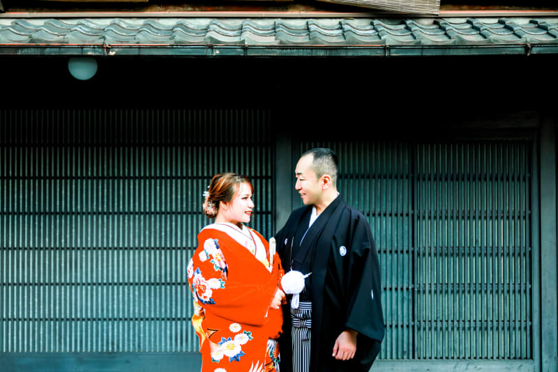まずは、お二人が祇園の街をお散歩するカットからスタート。石畳の道を歩きながらのショットでは、自然と寄り添い合うお二人の笑顔が印象的でした。