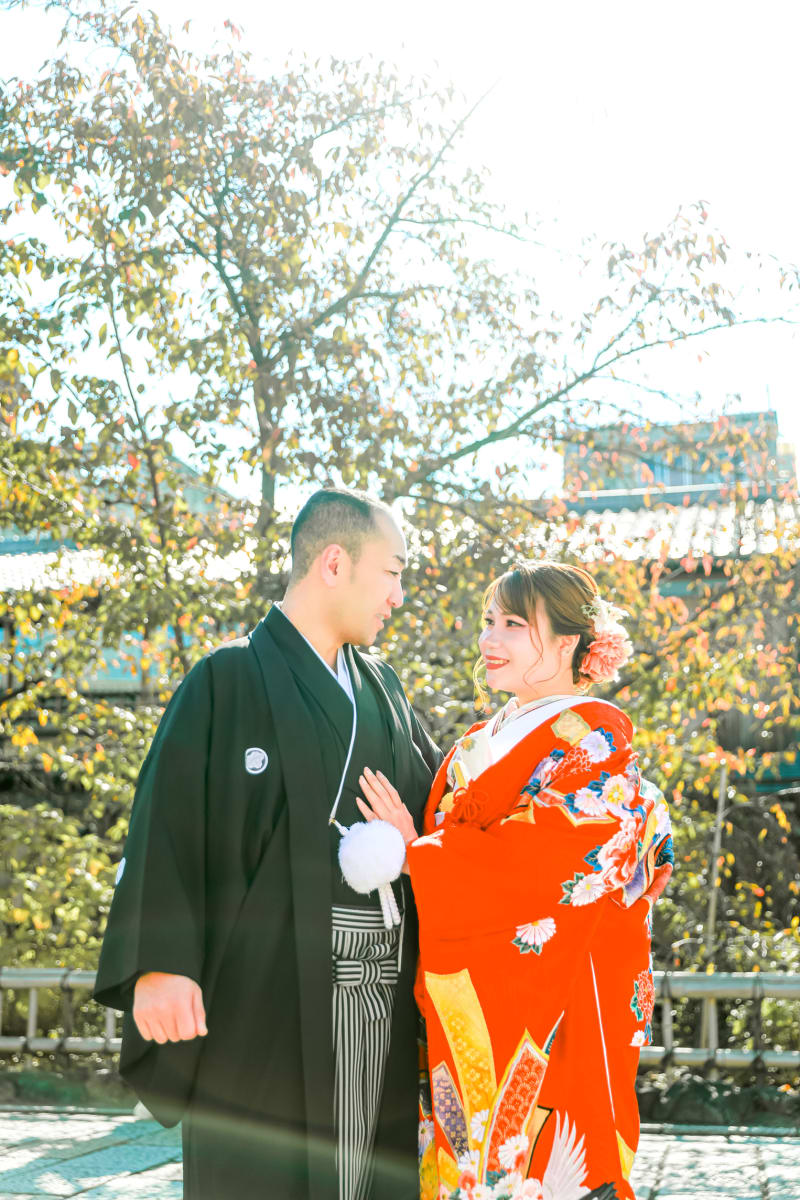秋が深まり、紅葉が色付き始めた祇園の街並みがウェディングフォトの舞台となりました。