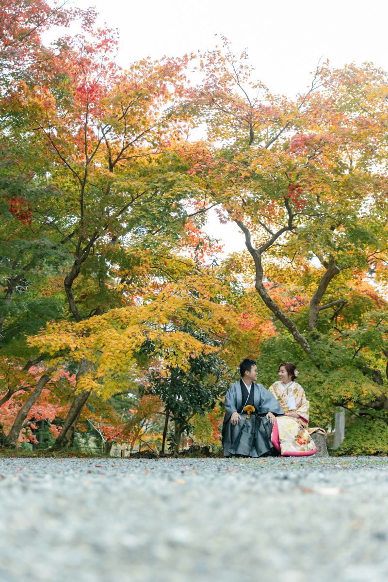 背景に広がる紅葉が、さまざまな色彩でお二人を引き立て、華やぎを添えてくれました。
