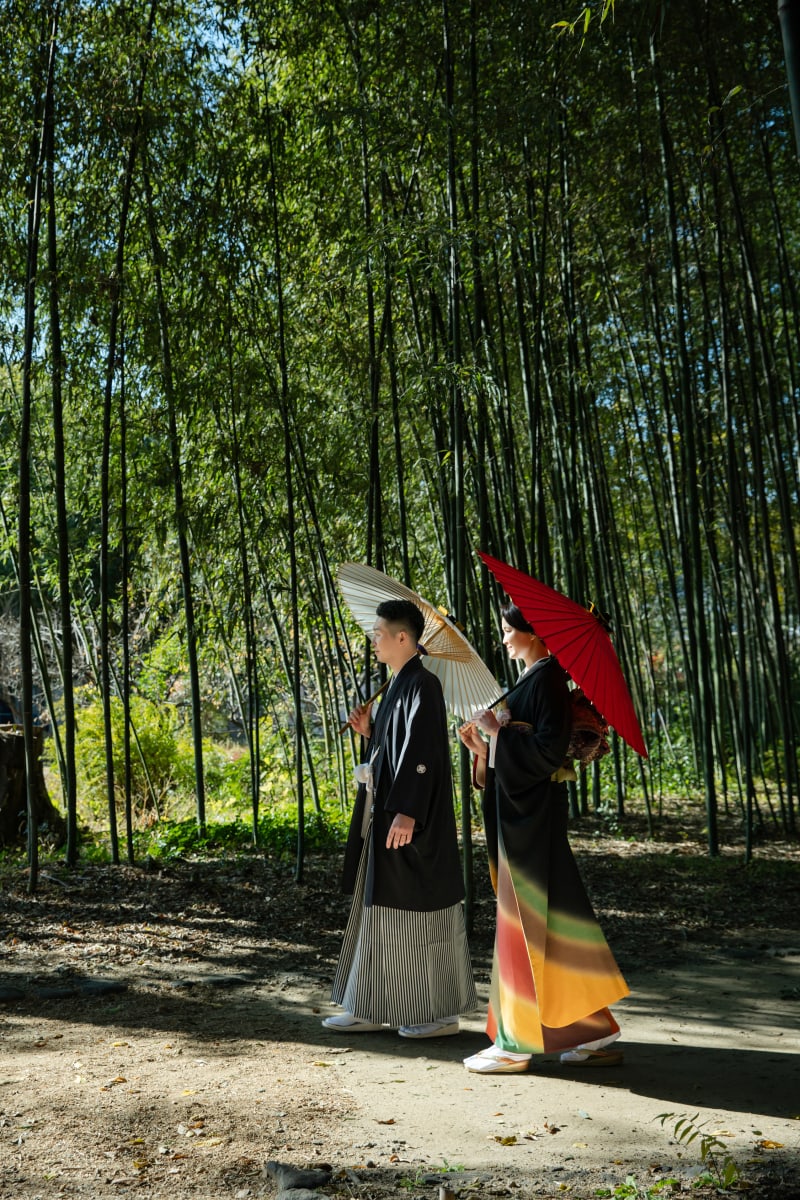 この季節、紅葉が美しく色づいており、その赤く染まる葉が、新郎新婦お二人の黒い衣装をいっそう引き立てていました。