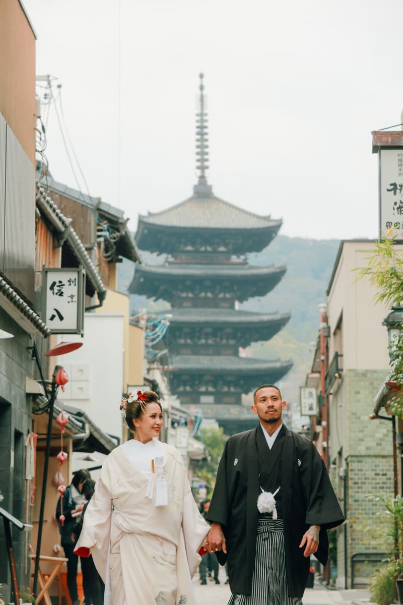 凛とした紋付姿の新郎様と、白無垢で彩られた新婦様が京都の情景に見事に溶け込みます