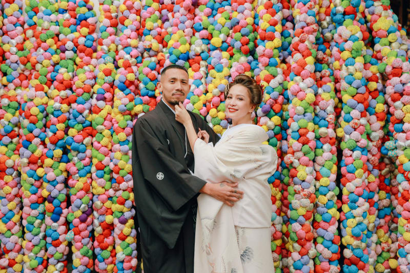 さらに、八坂庚申堂に移動しての撮影では、カラフルなさるぼぼを背景に自然な二人の姿をキャッチ。