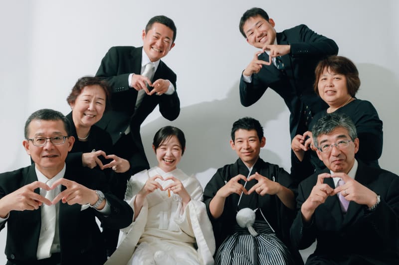 新郎新婦を中心に、ご家族の皆様の手でハートを作っていただきました。